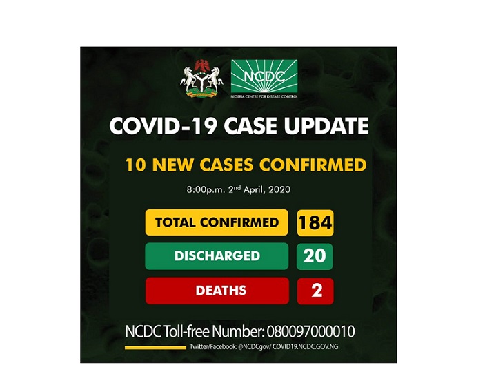 It added that as at 08:00 pm 2nd April there are 184 confirmed cases of #COVID19 reported in Nigeria. Twenty have been discharged with two deaths