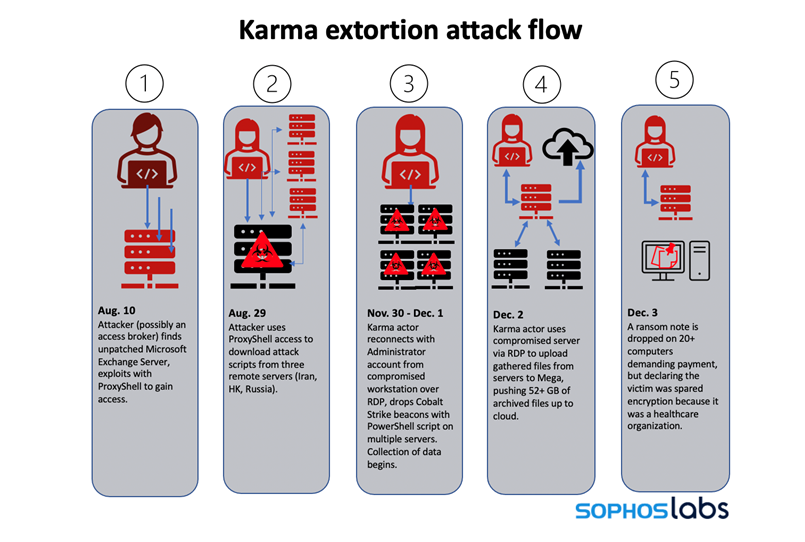 Sophos believes that the first incident started on Aug. 10, 2021, when attackers, possibly Initial Access Brokers, used a ProxyShell exploit to gain access to the network and establish a foothold on the compromised server. The Sophos investigation showed that almost four months passed before Karma appeared on Nov. 30, 2021, and exfiltrated more than 52 gigabytes of data to the cloud.