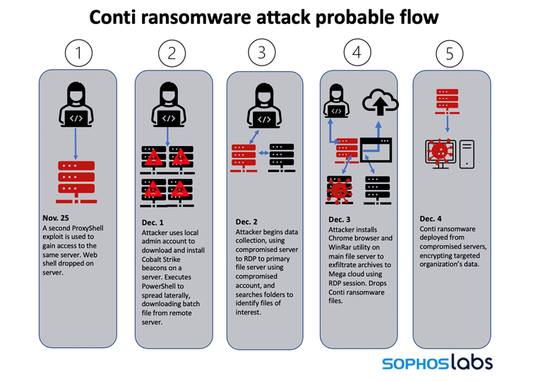While Sophos was onboarding, Conti deployed its ransomware on Dec. 4, 2021. Sophos subsequently tracked the start of the Conti attack to another ProxyShell exploit leveraged on Nov. 25, 2021.